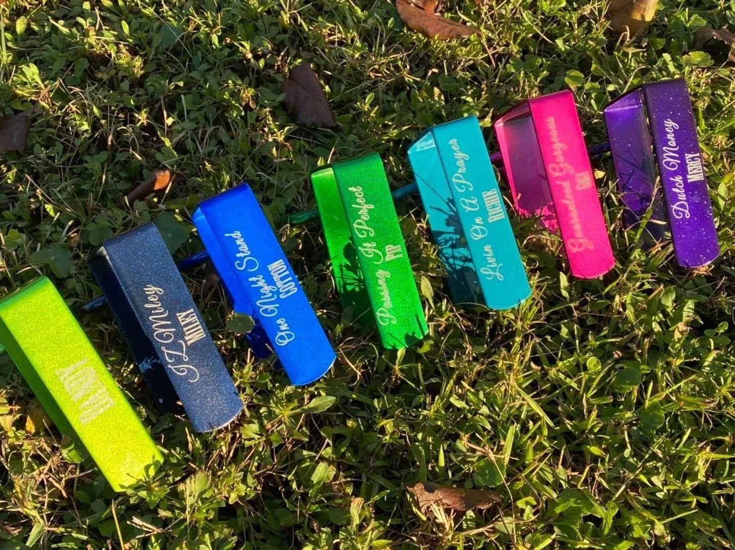 The color options are endless. These are custom powder coated in house. Solid colors and metallics available. They will engrave to silver. Please try to keep engraving simple due to a small engravable area.